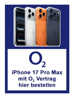 Anfang September 2025 hat Apple das neue iPhone 17 Pro Max vorgestellt. Ein Bundle aus o2 Tarif mit Apple Handy gibt es schon ab 62,99 €, mit Unlimited Tarif ab 67,99 € – mehr Preise und hier bestellen. Alternativ gibt es bei o2 das iPhone Air, 17, 17 Pro, 16 und weitere Modelle.